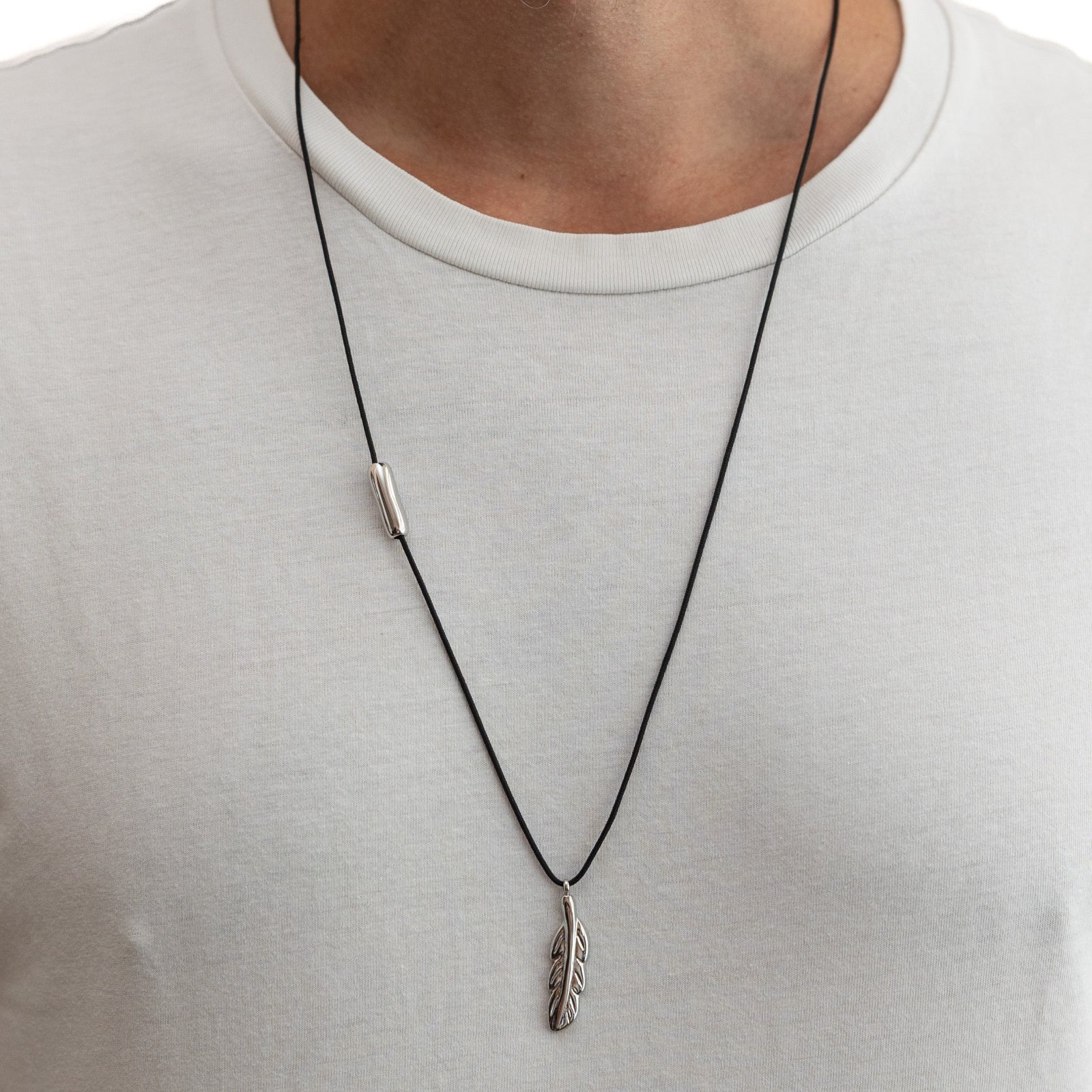 Steel feather necklace on 1.5 mm thick and 80 cm circumference black cord