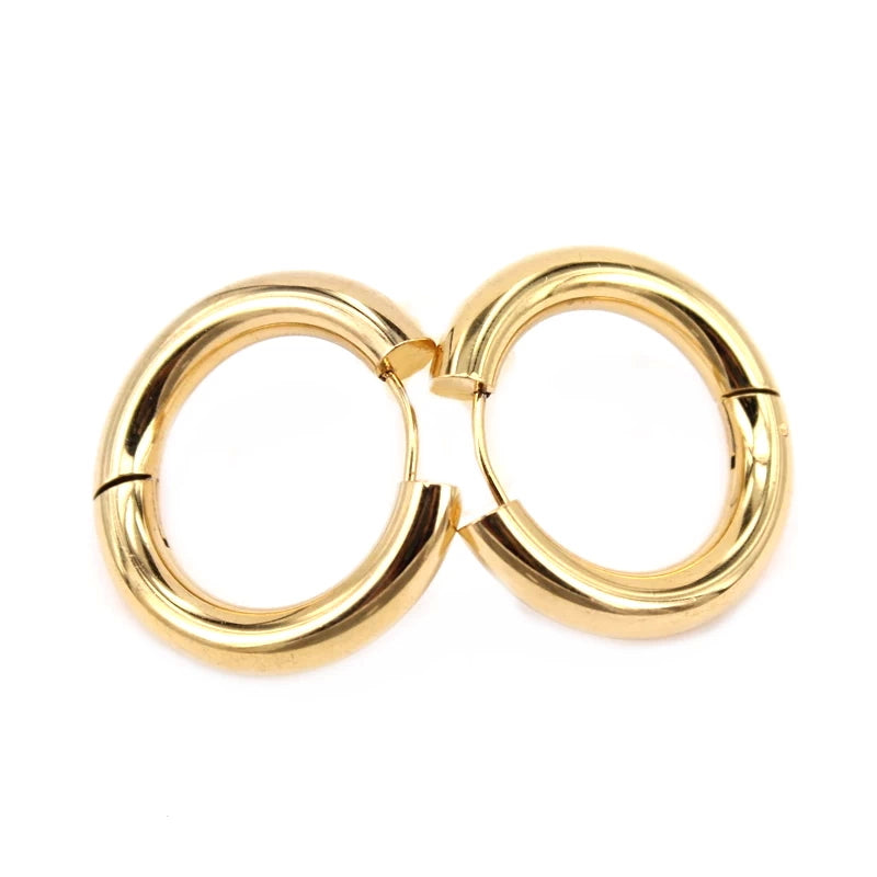 Χρυσα ατσαλινα σκουλαρίκια κρίκοι διαμέτρου 14mm και πάχους 3mm. Είναι αρκετά ελαφριοί για να φοριούνται άνετα όλες τις ώρες! Ένα διαχρονικό και μοντέρνο κόσμημα!